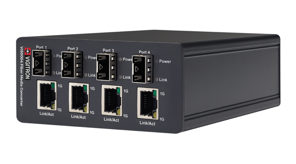 El Vi50004 de Vigitron es un convertidor de medios de fibra a UTP de 4 puertos que permite transmitir señales Ethernet a través de diferentes tipos de cables de fibra óptica.